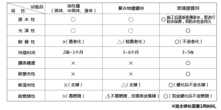 另外,玻璃性质镀晶剂因形成的膜面非常坚硬,不易产生划痕(耐擦伤性),硬化后即使用酒精进行脱脂,膜面也完好无损(耐溶剂性),不会燃烧(耐燃烧性),这些都是油性蜡及聚合物镀膜剂所不具备的卓越特性。